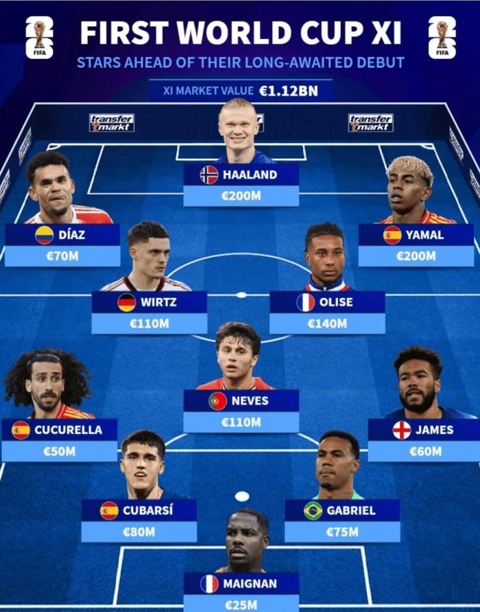 前锋:迪亚斯(哥伦比亚,7000万欧)、哈兰德(挪威,2亿欧)、亚马尔(西班牙,2亿欧)